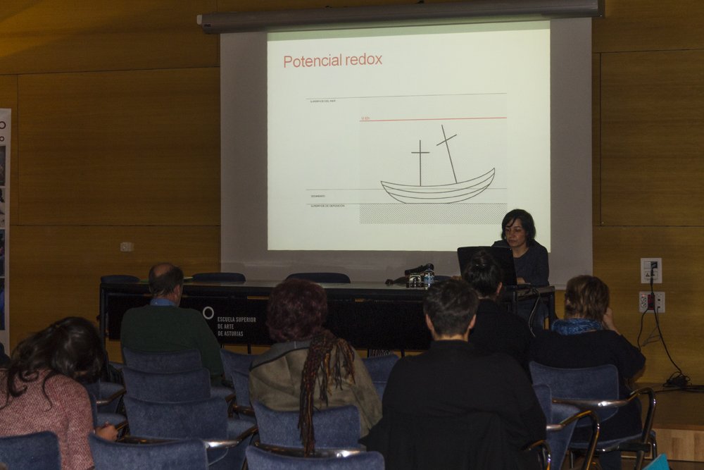 Victoria Folgueiras Fariña durante su conferencia "La conservación de metales de procedencia subacuática: ejemplos de varios pecios de la costa gallega"