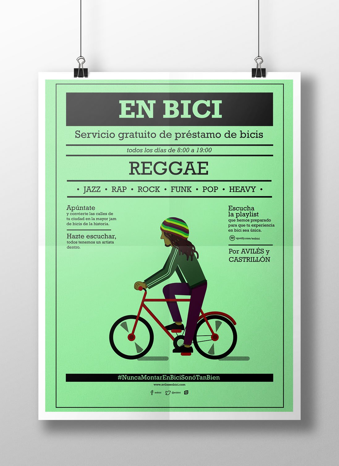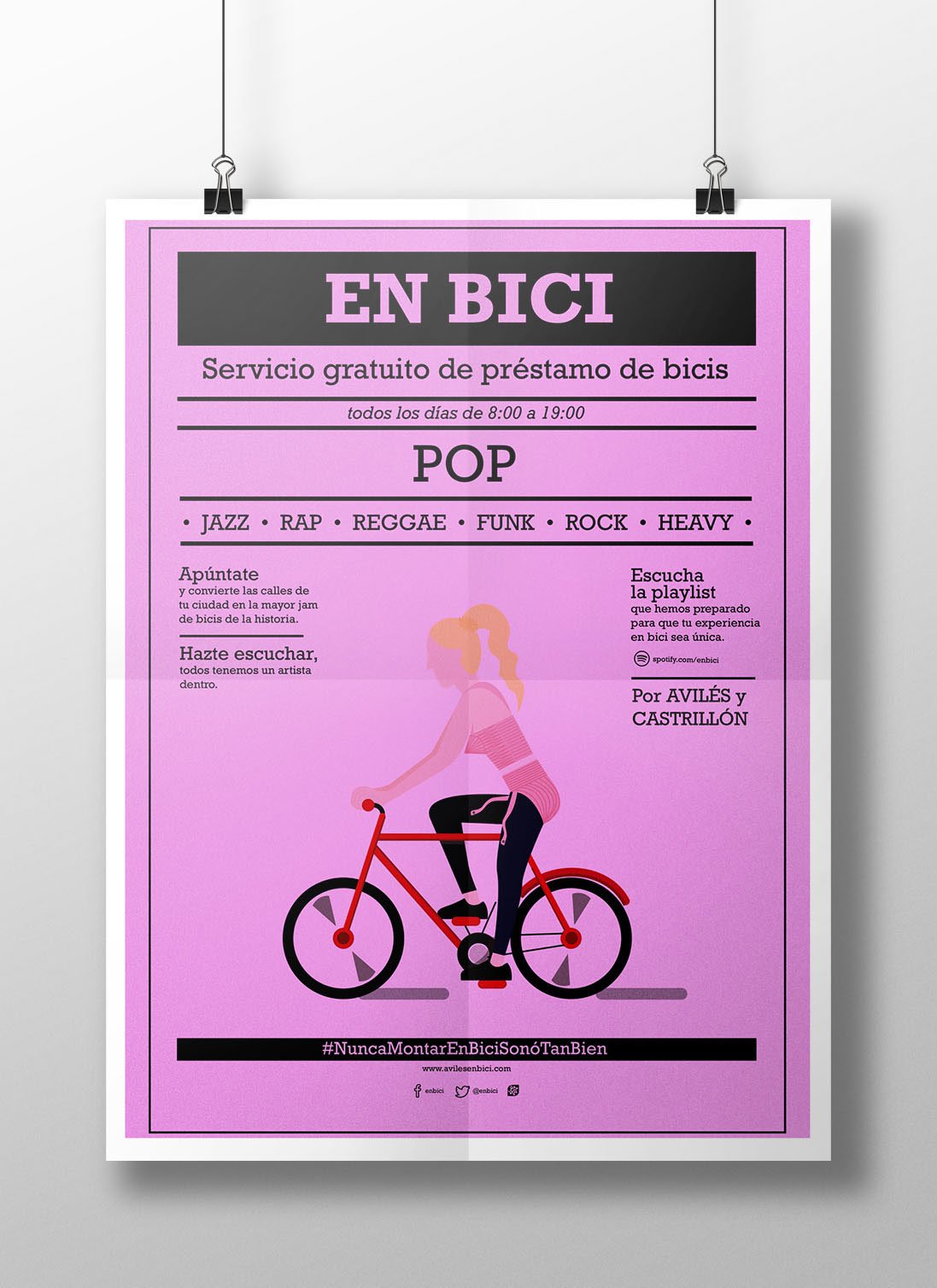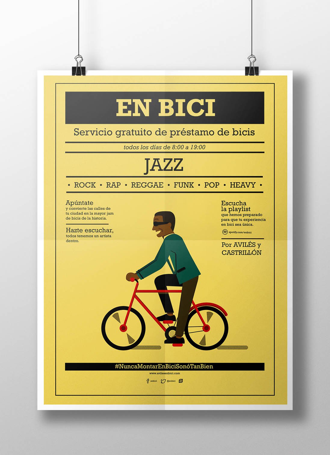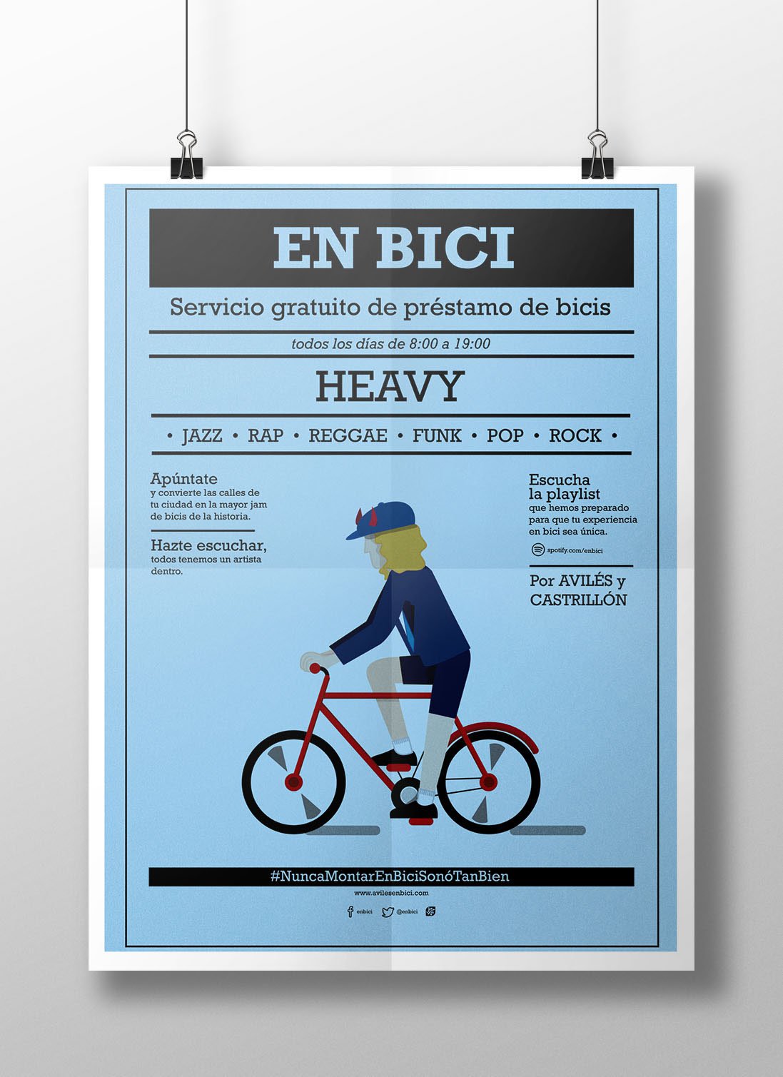 Campaña publicitaria ficticia para promocionar el sevicio gratuito de préstamo de bicicletas en Avilés y Castrillón. La campaña gira en torno a la música y toma como referencia el estilo de carteles para festivales.